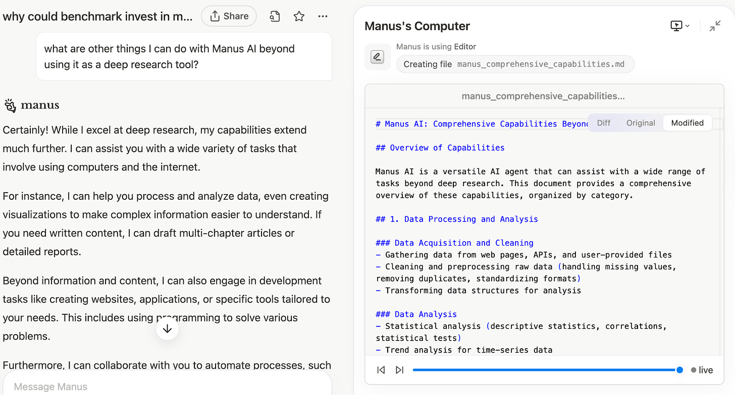 And to better understand what a general AI agent can do, I asked “the best agent out there right now” - Manus itself, what else I could use it for besides deep research tasks, and it told me: