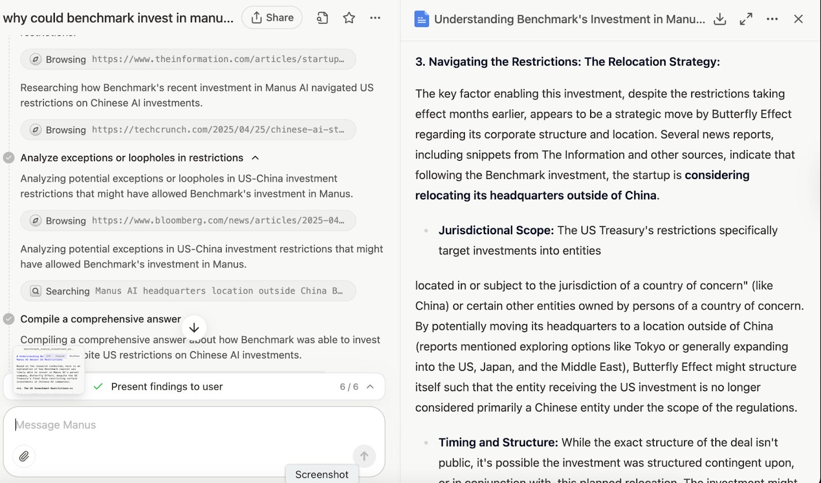 But the explanation offered by Manus itself said: “In summary, Benchmark's investment in Manus AI's parent company, occurring after the US restrictions came into effect, was likely made possible by the startup's strategic consideration to relocate its headquarters outside of China. This move potentially places the relevant corporate entity outside the direct jurisdictional scope of the US Treasury's Final Rule, allowing the US venture capital firm to invest while navigating the complex geopolitical and regulatory landscape surrounding US-China technology investments.”