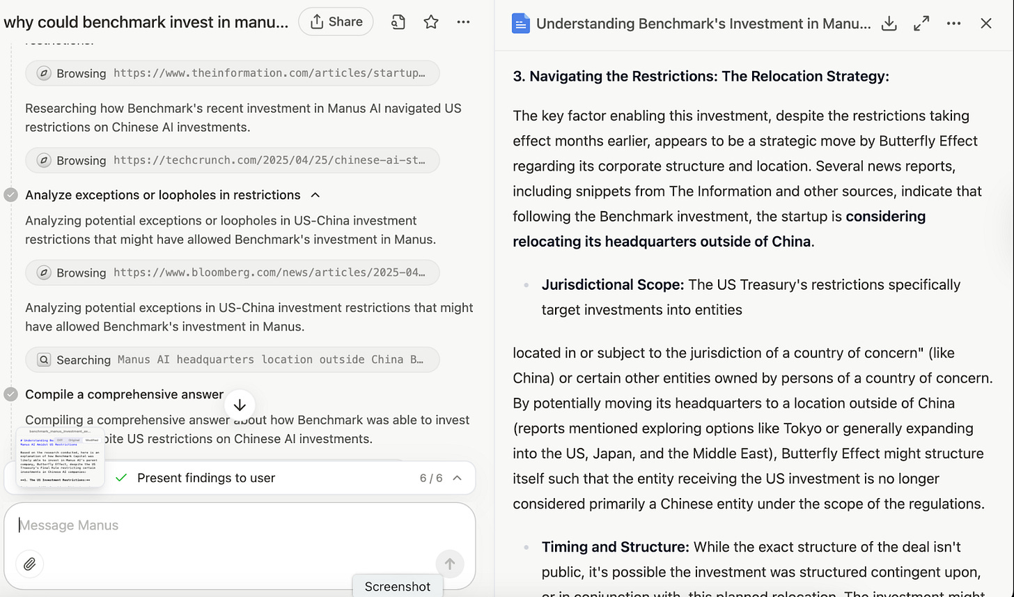 Some of you may ask why Benchmark is allowed to invest in Manus AI. As many of you know, a rule that went into effect in January this year prohibited U.S. investors from investing in Chinese semiconductors, quantum computing, and AI. (which low-key led to some scares across China-based U.S. nationals/ investors and institutions)