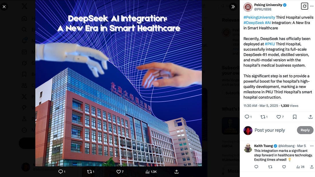 Entrepreneurs then have the opportunity to utilize these models as free scaffolding. Taking the EV industry as an example, over twenty Chinese automakers, including BYD, Geely, and Great Wall Motors, have integrated DeepSeek into their in-car AI systems to enhance smart assistants and autonomous driving capabilities. In healthcare, it is said that nearly 100 hospitals across the country have now integrated DeepSeek for medical imaging analysis and clinical diagnosis support. Every new integration expands the model’s footprint, tightens switching costs, and shifts margins to the services sitting on top.
