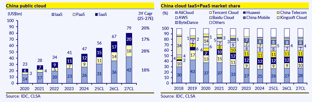 CLSA’s latest China Internet: AI Superpowers 2.0 report makes a bold call: it says that with the explosion of AI applications, spanning everything from gaming to digital agents, China’s public cloud market could grow at more than 20% CAGR through 2027, reaching USD 80 billion. If true, that would be a huge win for the country’s leading providers—Alibaba, Tencent, Baidu, and ByteDance—who are building not just raw infrastructure, but “cloud-plus” services that bundle proprietary models, technology, and talent.