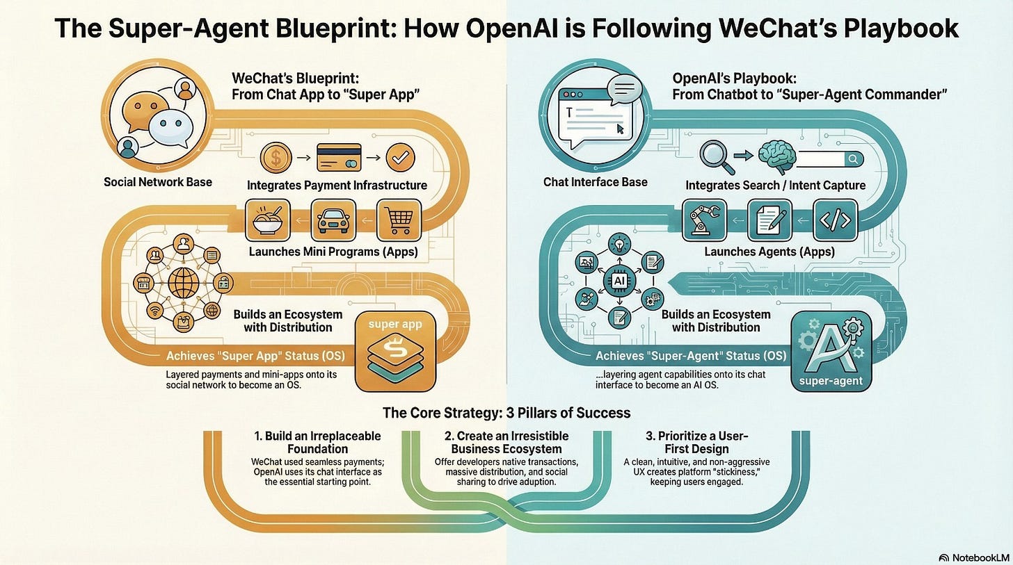 To be super clear: I’m not saying OpenAI and WeChat share the same business model. I’m using WeChat as a mental model. In my head, ChatGPT is the surface where intent lives; OpenAI’s agents/apps are the Mini Programs—lightweight, in-flow capabilities the surface can discover, invoke, and compose.