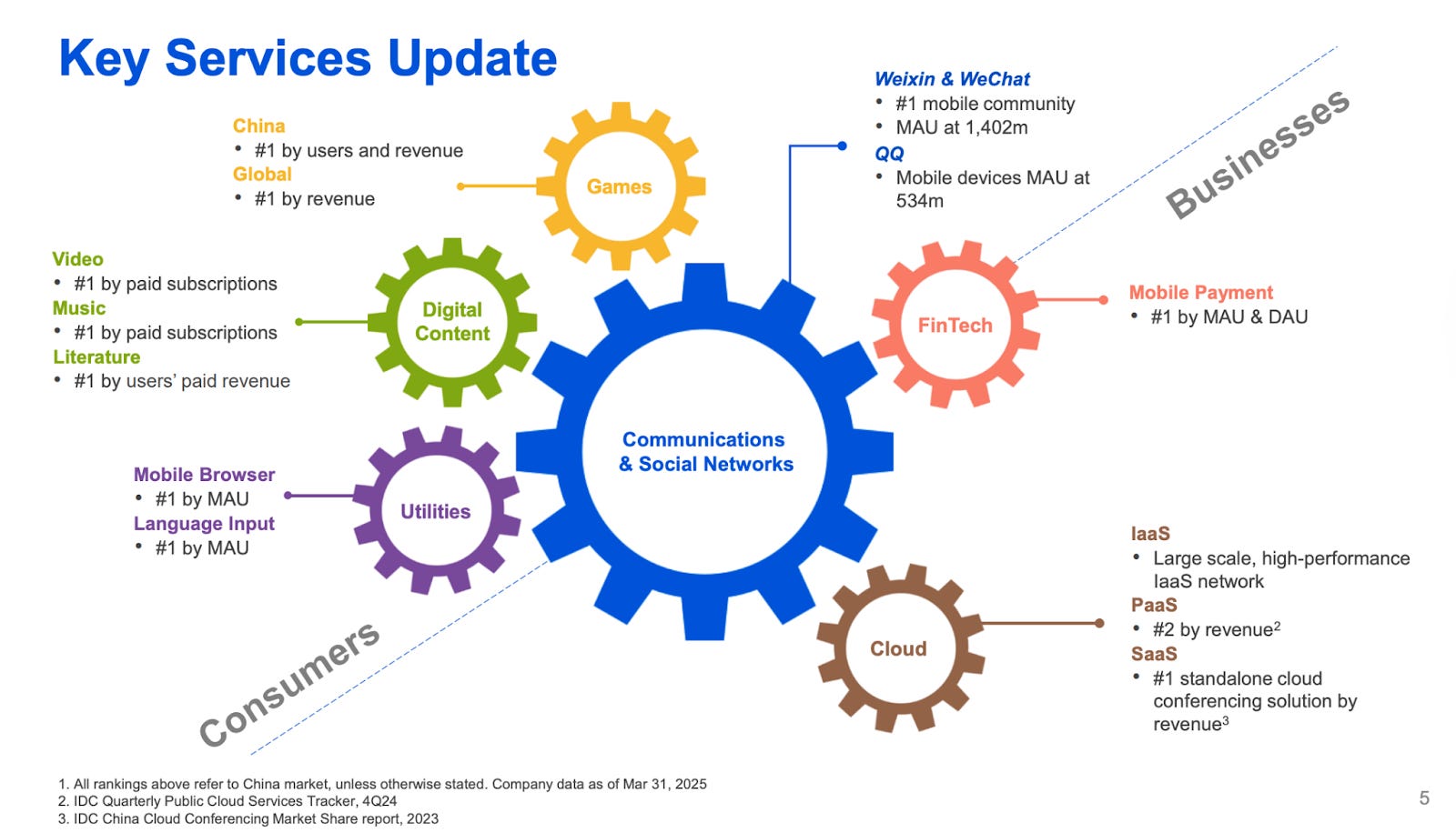 It's not entirely apples-to-apples, but similar to Meta, where WhatsApp, Instagram, and Facebook operate independently with separate corporate and product teams, Tencent’s main businesses like Games, WeChat, and others also function independently. Then there is a group-level corporate team, such as the legal, IR, and PR teams, which consolidates the businesses under the same P&L for the listed company that is then overseen by the C-levels.
