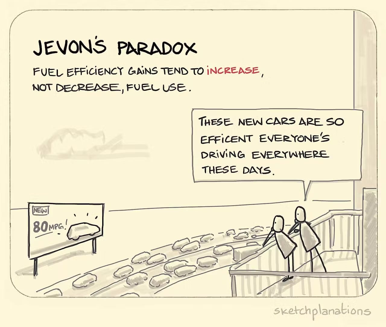 In layman’s terms, when technology becomes cheaper, usage explodes—even if it feels just "good enough." For example, in the 1800s, burning coal became more efficient, but factories used more coal to power new machines instead of reducing demand.