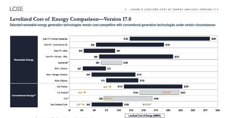 See chart here from Lazard’s Levelized Cost of Energy Comparison (LCOE) 2024 Report.
